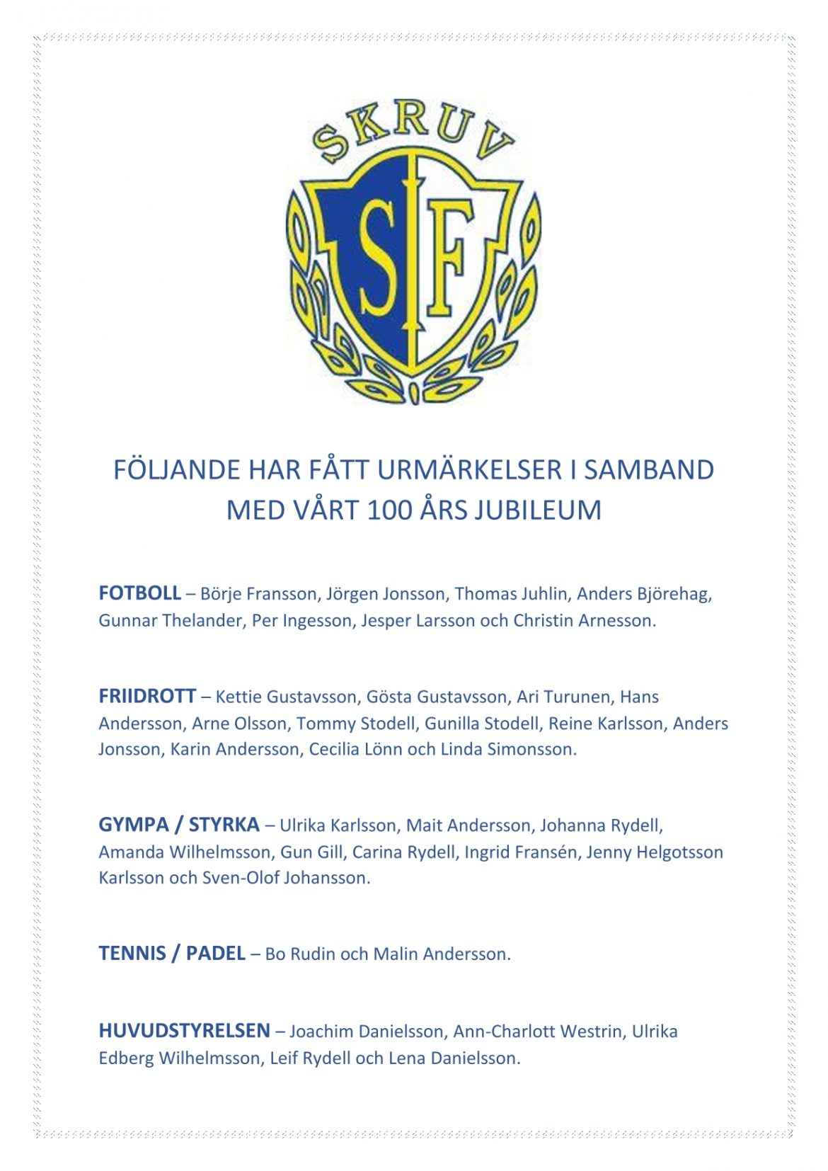 Följande personer har fått utmärkelse i samband med vårt 100års jubileum. Stort tack till ert engagemang i vår förening 🌟🌟🌟