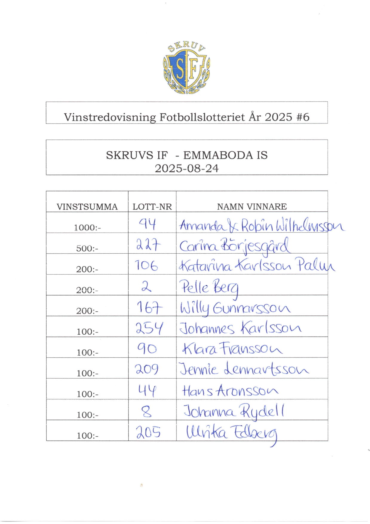 Under gårdagens hemmamatch mot Emmaboda IS så hade vi även den sjätte dragningen i årets fotbollslotteri. Ett stort grattis till alla vinnare! #skruvsif #sjättedragningen #iblåttovitt 💙🤍⚽