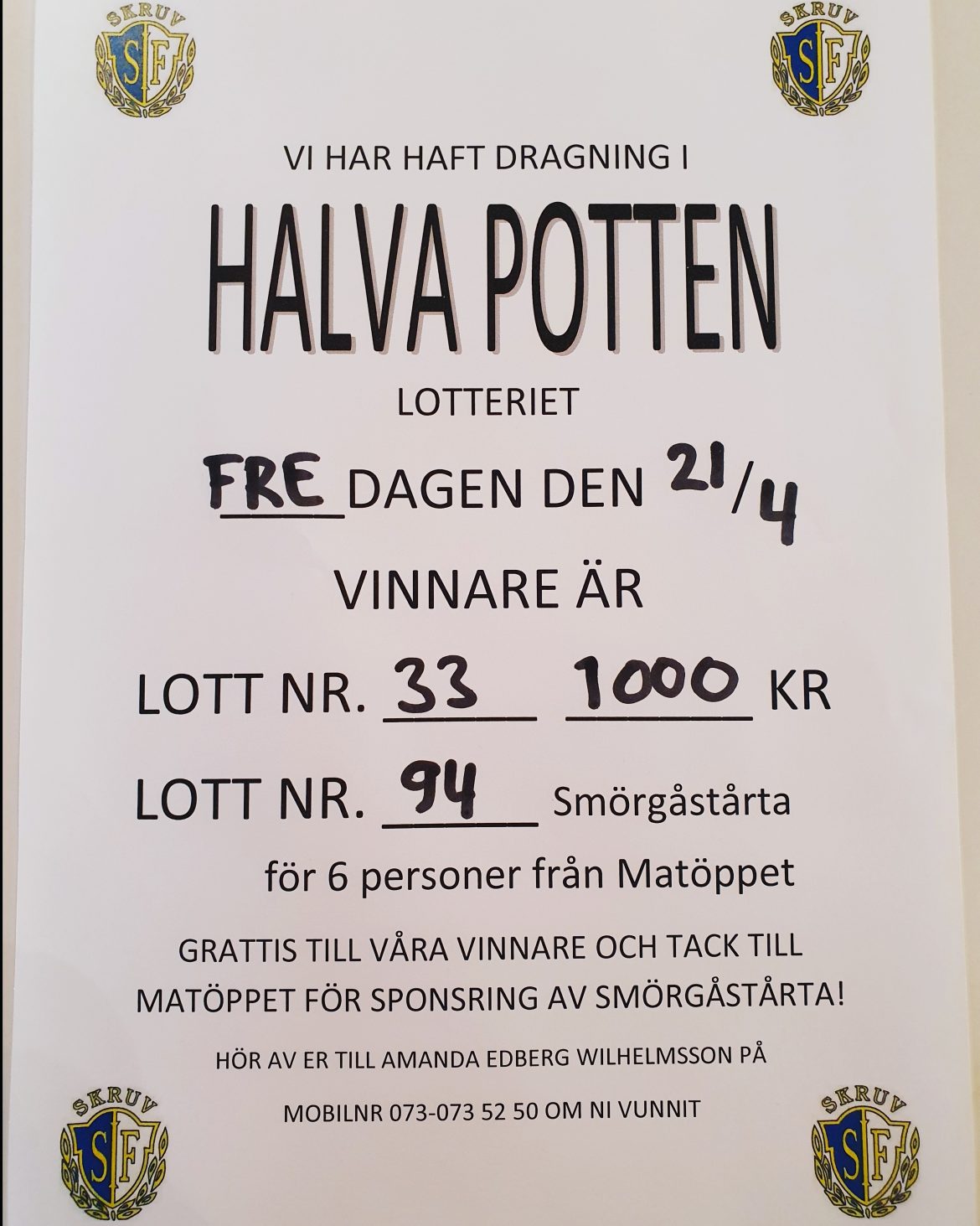 På hemma matchen i fredags hade vi även dragning i halva potten lotteriet. 1000 kr går till lottnr. 33 och smörgåstårtan som sponsrats av Matöppet i Skruv går till lottnr. 94. Grattis till vinnarna! #skruvsif #halvapotten ⚽️⚽️💙🤍💙⚽️⚽️