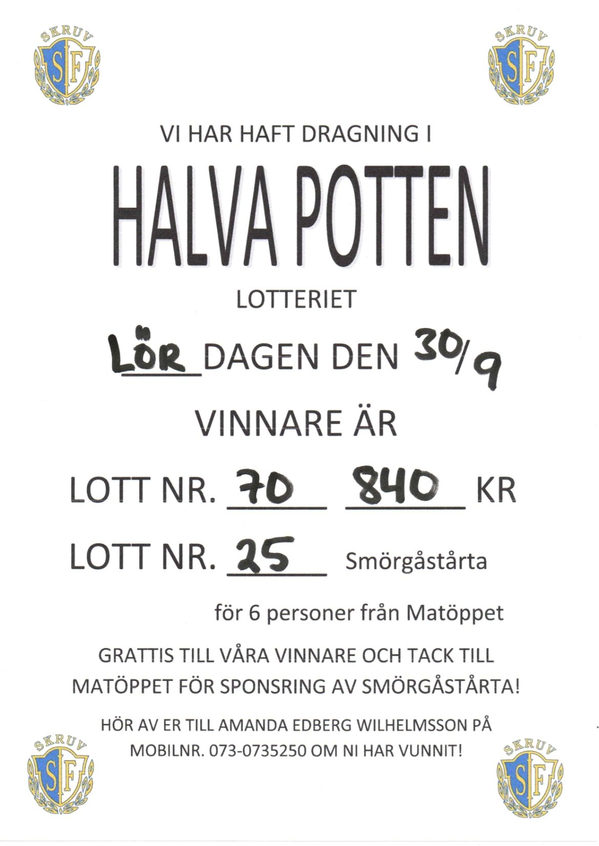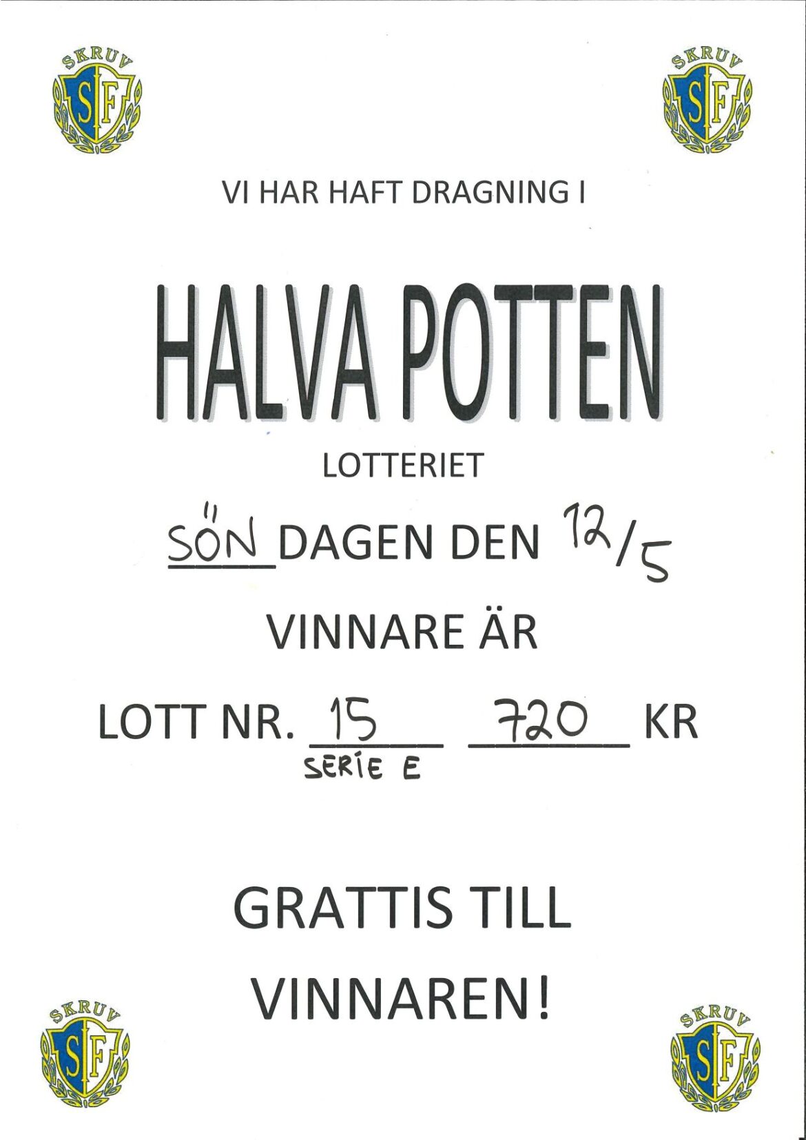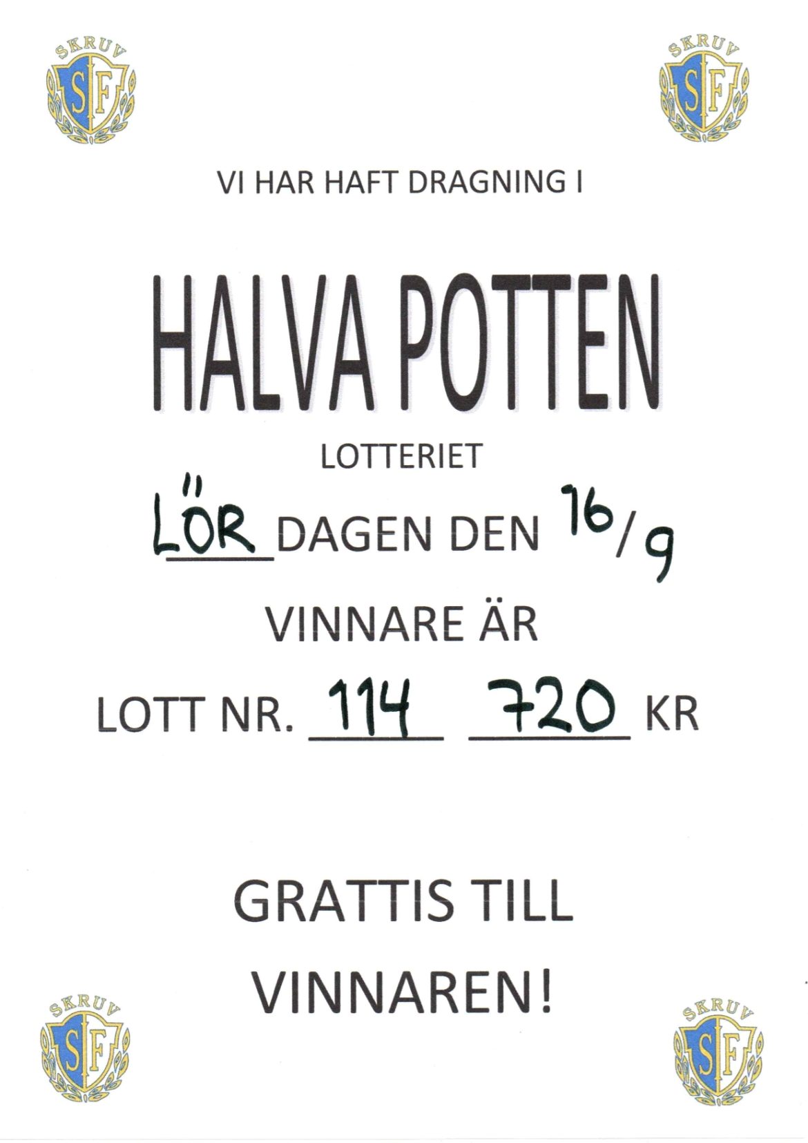 I går på hemmamatchen hade vi även dragning i halva potten lotteriet. 720 kr går till lott nr. 15, serie E. Grattis till vinnaren!