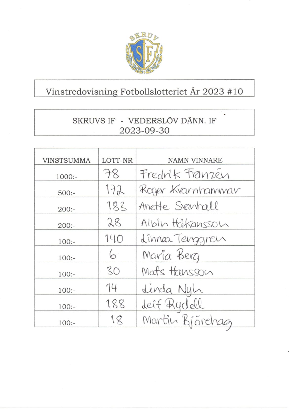 Under dagens hemmamatch mot Vederslöv-Dänn. IF så hade vi den tionde och sista dragningen i årets fotbollslotteri. Ett stort grattis till alla vinnare! Tusen tack till ALLA som köpt fotbollslotter av oss under året! #skruvsif #tiondedragningen #iblåttovitt ⚽️💙🤍💙🤍💙🤍💙⚽️