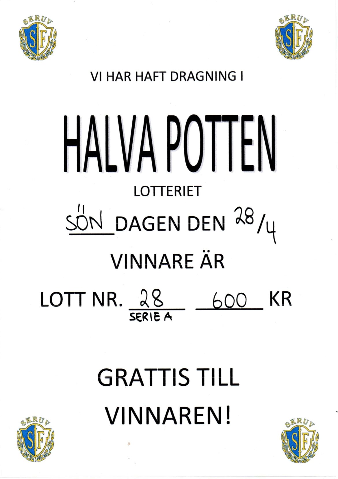 I går på hemmamatchen hade vi även dragning i halva potten lotteriet. 840 kr går till lottnr. 70, serie Y och smörgåstårtan från Matöppet går till lott nr. 25, serie Y. Grattis till vinnarna! Kontakta Amanda Edberg Wilhelmsson på mobilnr. 073-073 52 50 för att lösa ut vinsten. #skruvsif #halvapotten ⚽️⚽️💙🤍💙⚽️⚽️