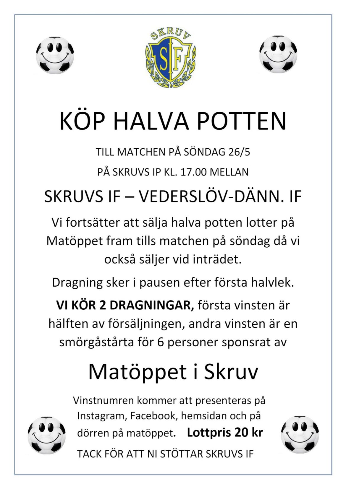 Stötta oss genom att köpa halva potten lotter. De finns att köpa på Matöppet fram tills matchen på söndag sen finns de att köpa vid inträdet. Vill någon ha hjälp med att köpa så kontakta Ulrika Edberg på mobilnr. 070-261 69 29 så löser vi det. Matöppet sponsrar även med en smörgåstårta så det blir två priser denna vecka!