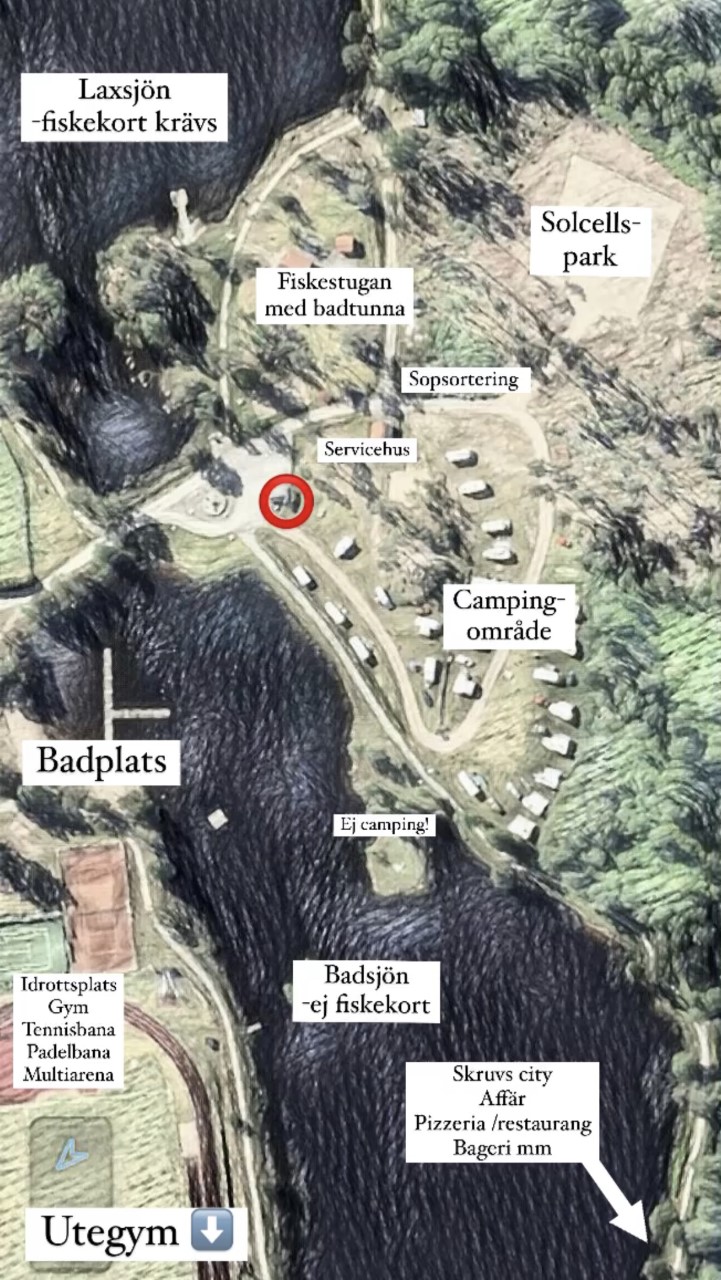 När du kommer fram till anslagstavlan vid campingen så ligger stugan uppe till vänster.
